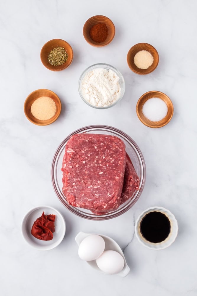 - Mix: In a large bowl, whisk together eggs, almond flour, tomato paste, coconut aminos, and spices. Add ground beef and gently combine until just mixed.