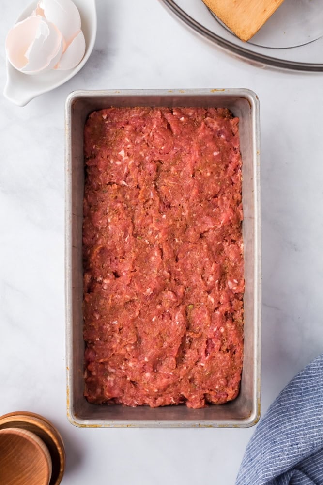 - Evenly spread the meat mixture in a 8” x 5” loaf pan.