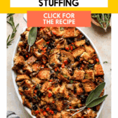 This stuffing pairs beautifully with all your holiday favorites — think roasted turkey, cranberry sauce, mashed potatoes, or green bean casserole. It’s one of those sides that ties the whole meal together.