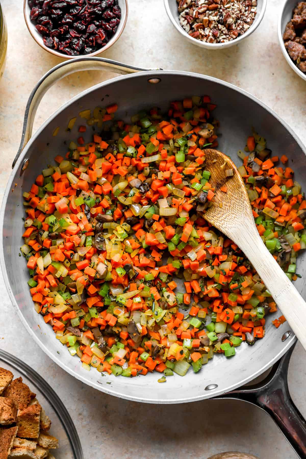 - Add the celery, carrots and onion and garlic and cook until translucent, about 7 minutes. Add the rosemary, sage and thyme and cook until fragrant, about 1 minute. Add the celery mixture to the bread cubes and toss to combine (if adding any optional additions, such as cooked sausage, add them in here). Transfer the mixture to the casserole.