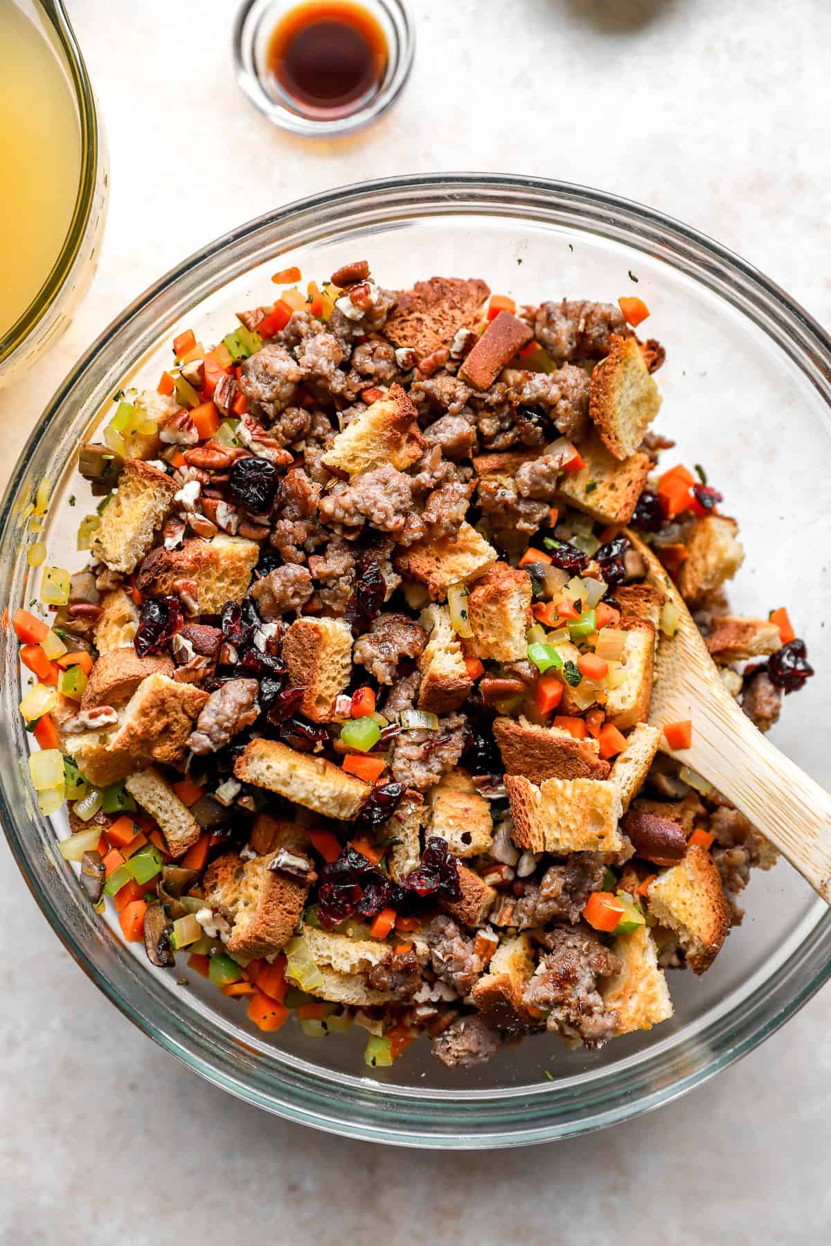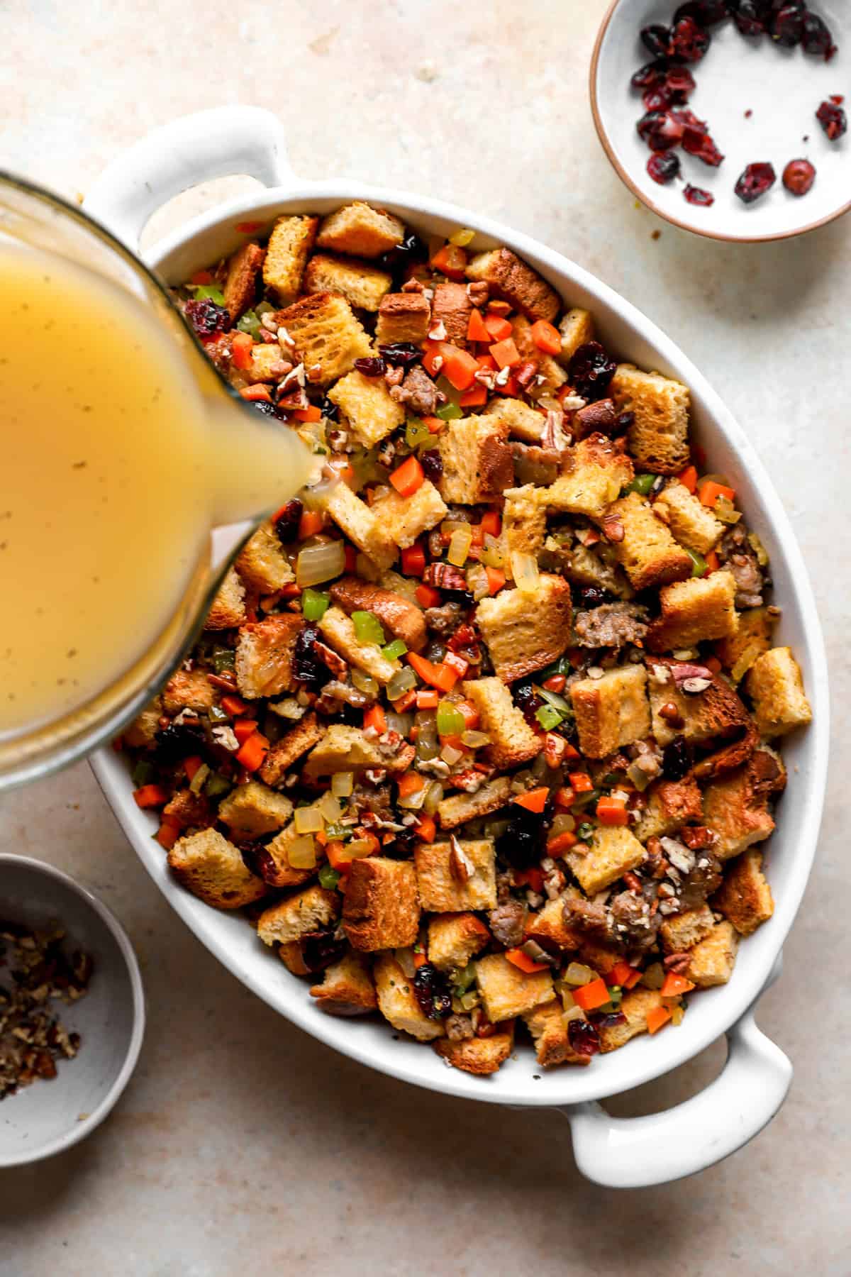 - Next, mix all the ingredients in a large bowl: the toasted bread cubes, cooked veggies, fresh herbs, eggs, and broth. You want the mixture just moistened — not soaked.