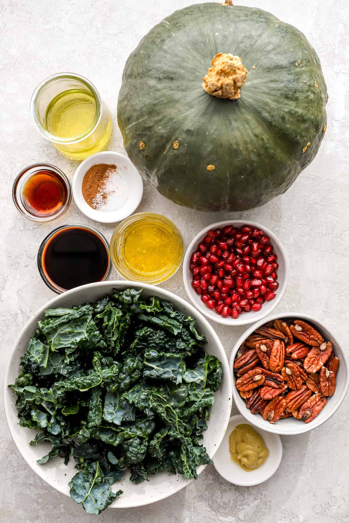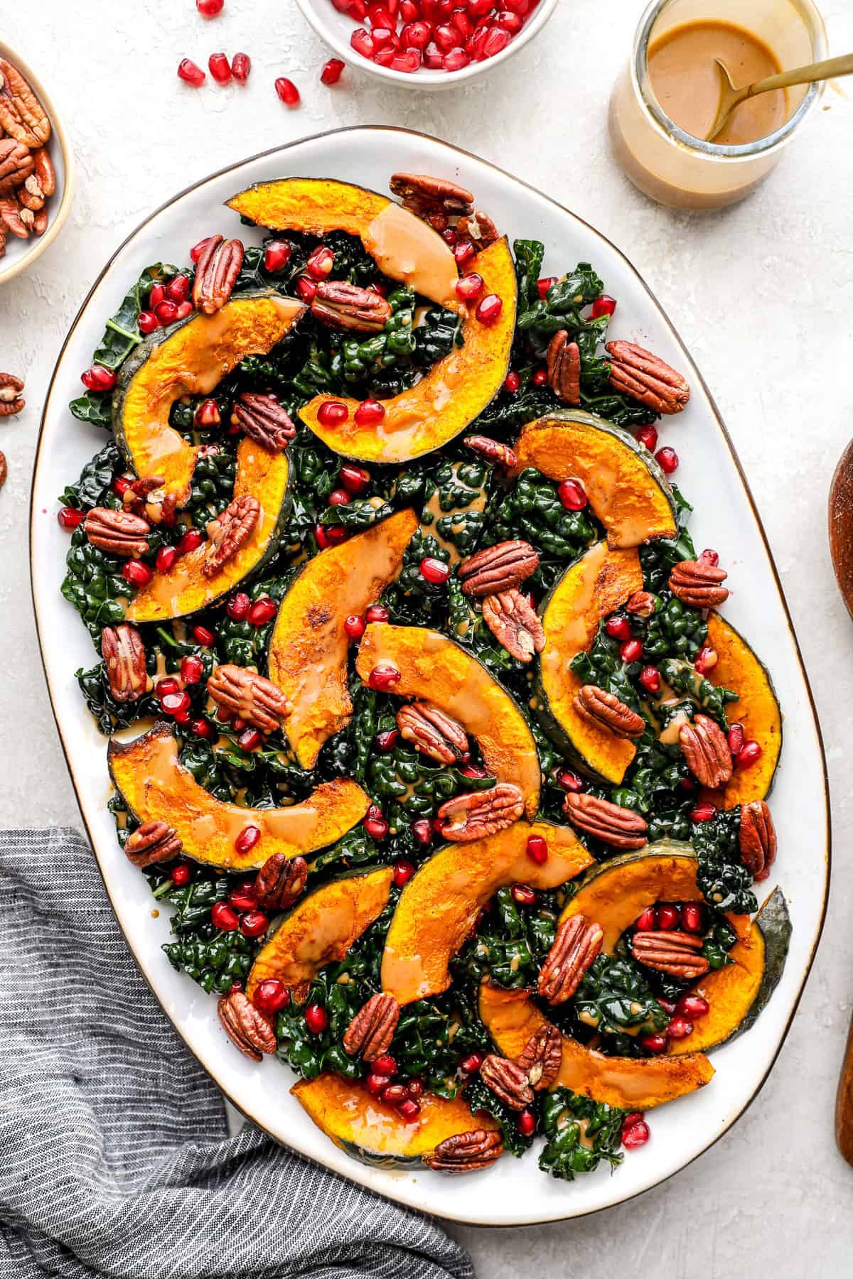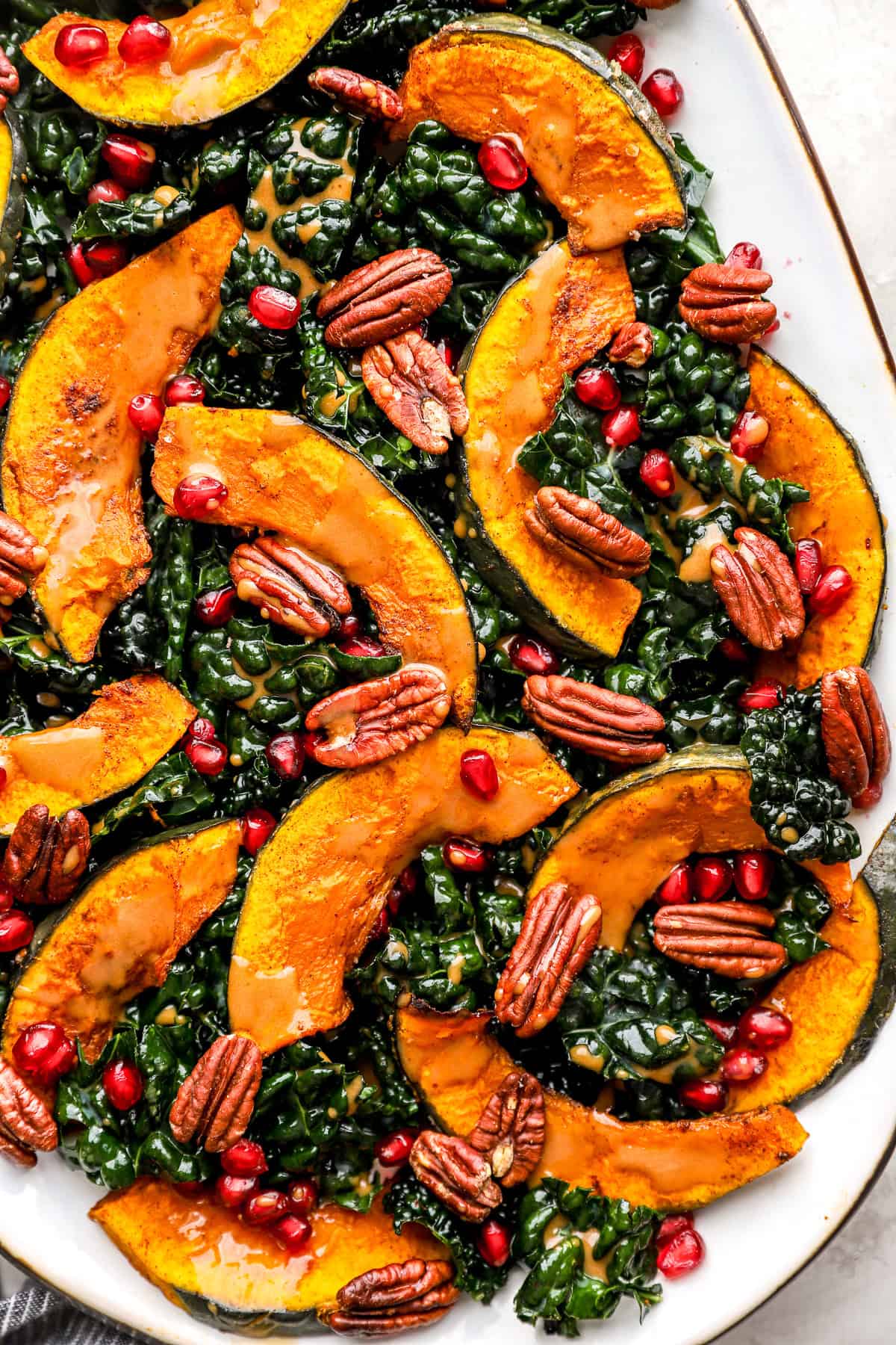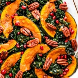 This salad brings together massaged leafy kale, sweet roasted kabocha squash, crunchy pecans, jewel-like pomegranate seeds (or a substitution of your choice), and a dreamy maple-balsamic dressing, all tossed together in the best dressing, for a salad that’s both wholesome and indulgent.