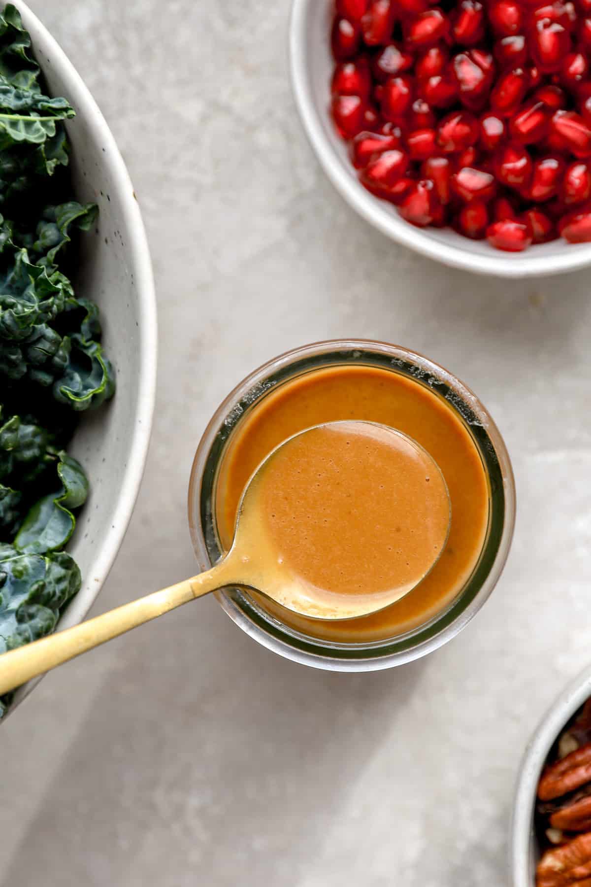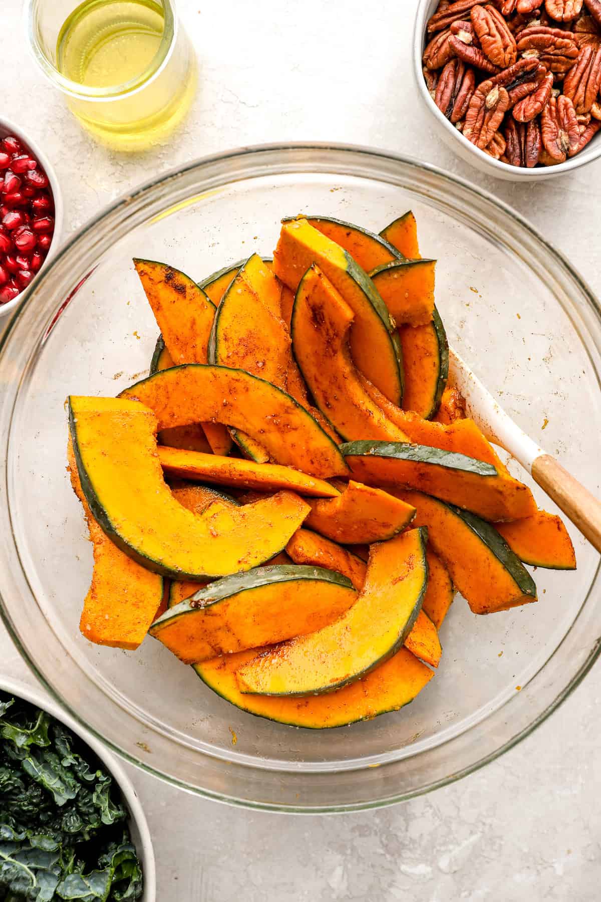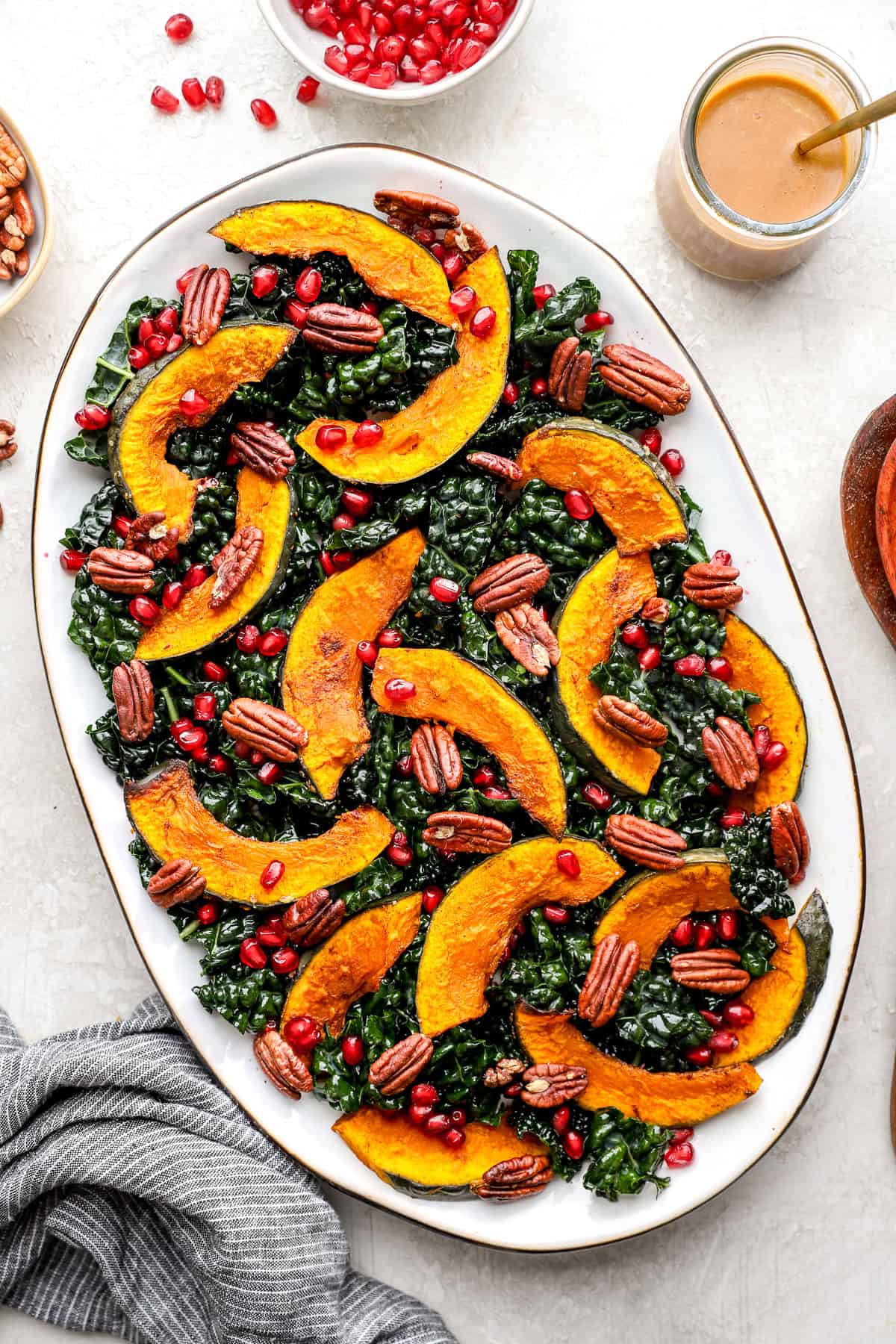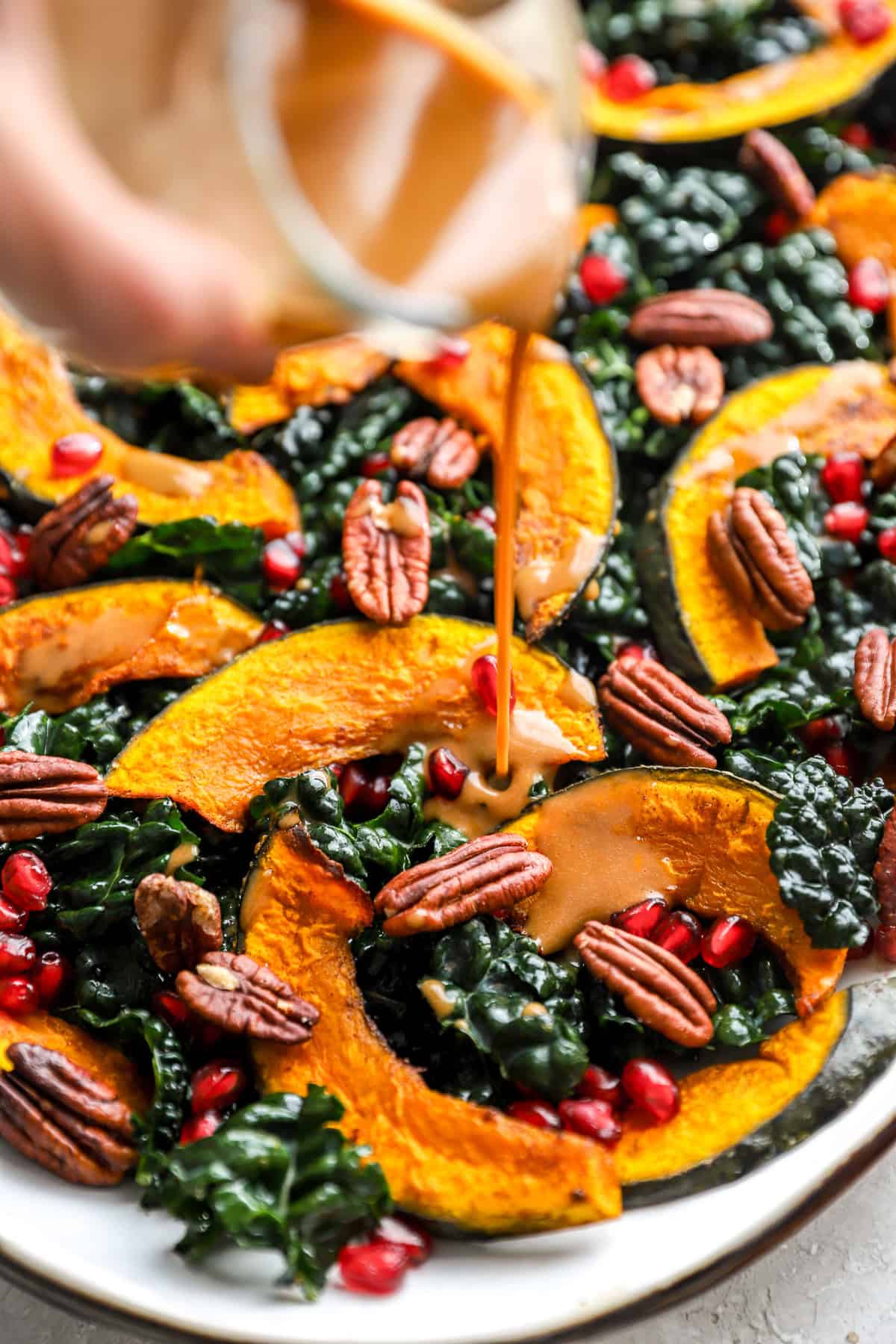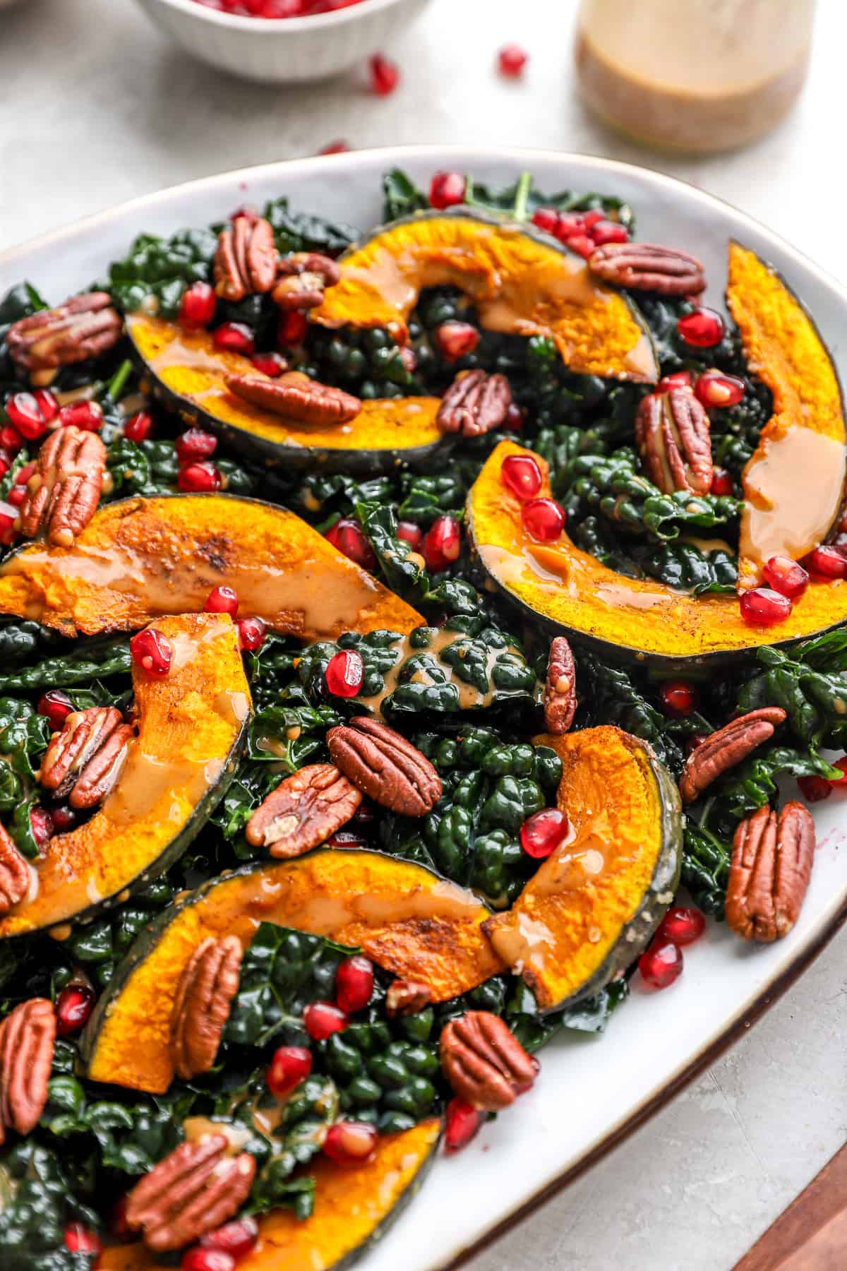 • Assemble Your Harvest Salad: In a large bowl add kale, squash, pomegranate seeds, and toasted pecans. Top with dressing and toss to combine.