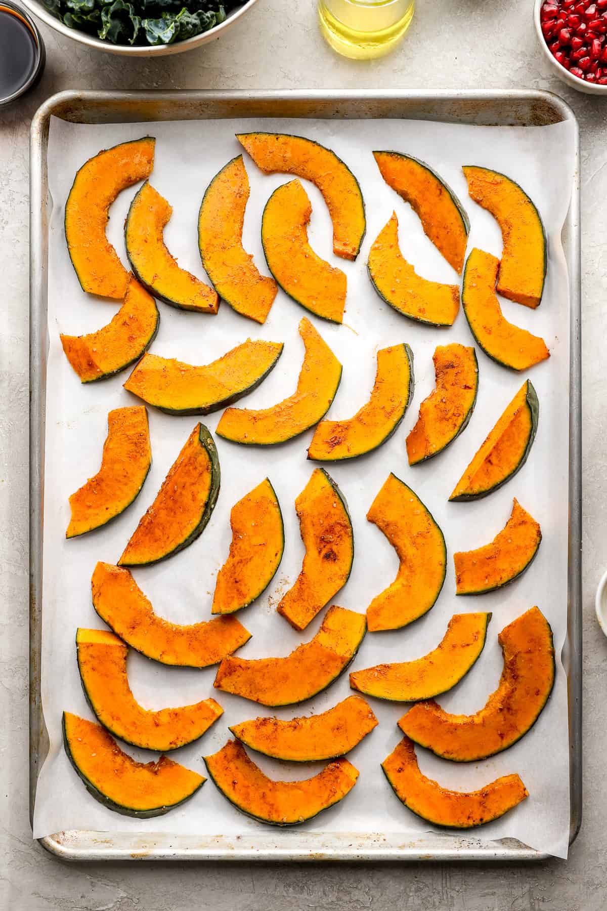 • Roast the squash. Preheat your oven to 400°F. Toss the kabocha squash cubes (or wedges) with a bit of oil, a pinch of salt, and a light dusting of cinnamon. Spread on a parchment-lined baking sheet and roast until fork-tender, about 20 minutes (depending on the size of your pieces). Remove from oven and let cool slightly.
