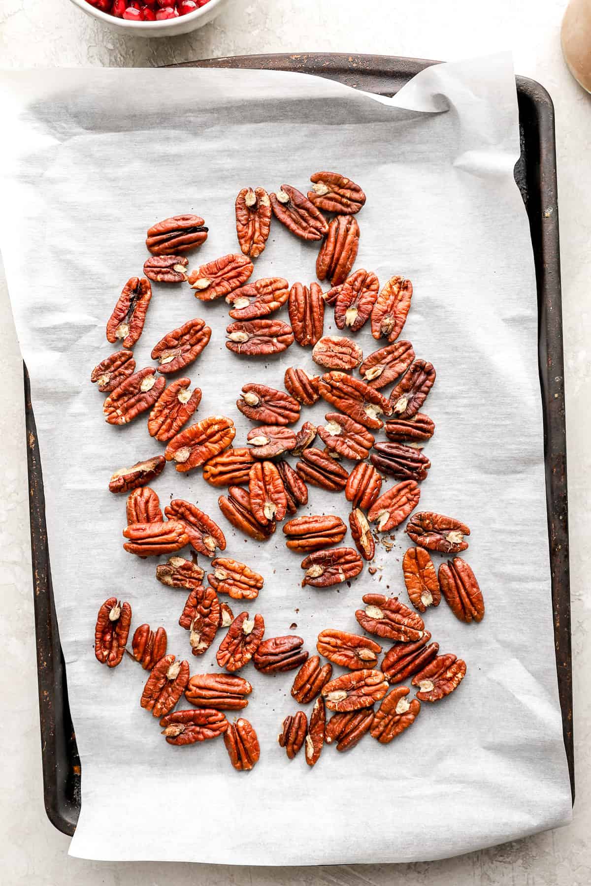 • Place pecans on a baking sheet and place in the oven for 5-7 minutes, tossing halfway through, watch to avoid burning.