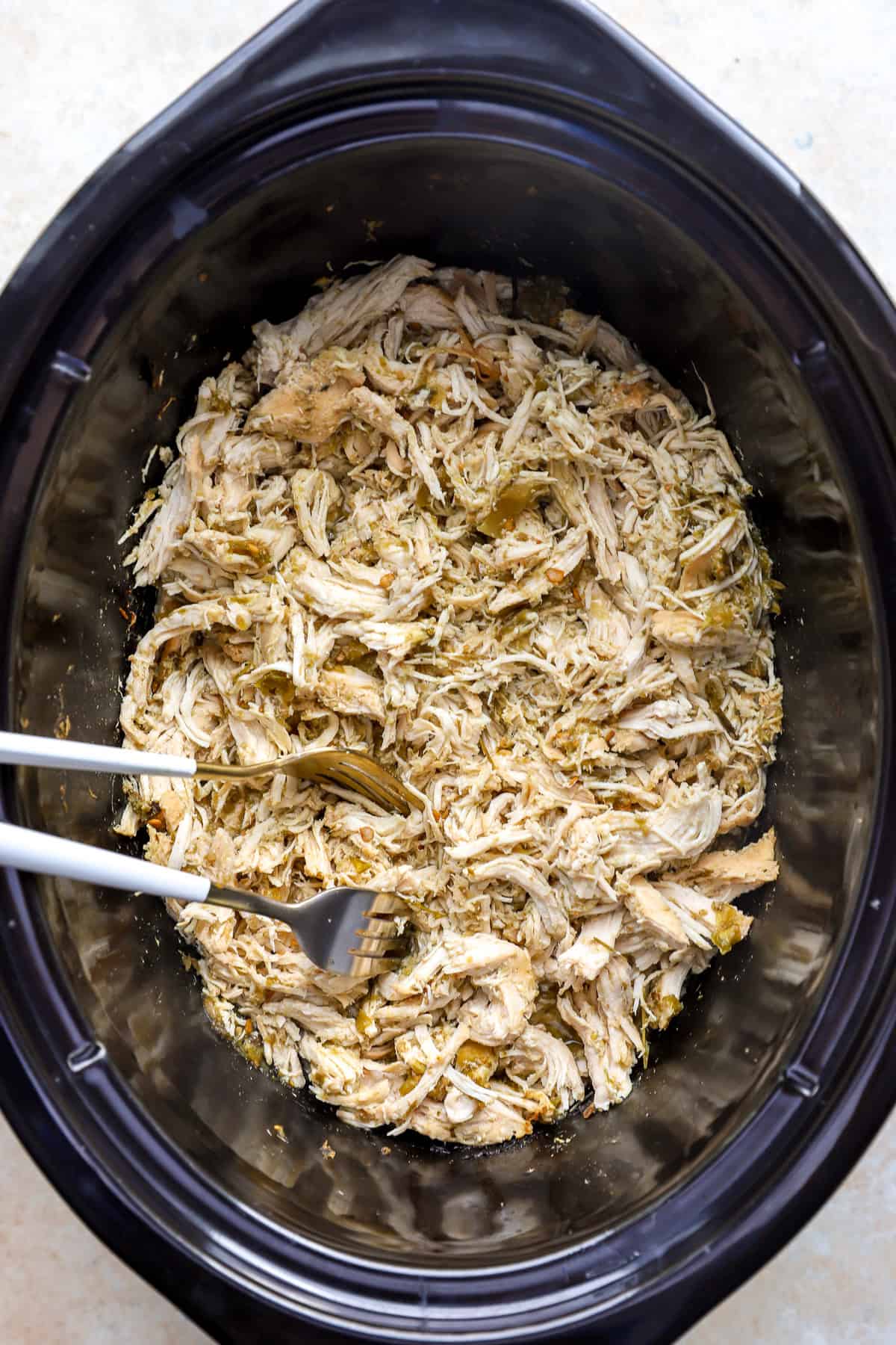- Pat chicken dry and season with salt and pepper. Place in a slow cooker and add 2 cups of salsa verde, or just enough to coat the chicken. Set slow cooker to 4 hours on high (or Instant Pot for 18 minutes). Shred and set aside.