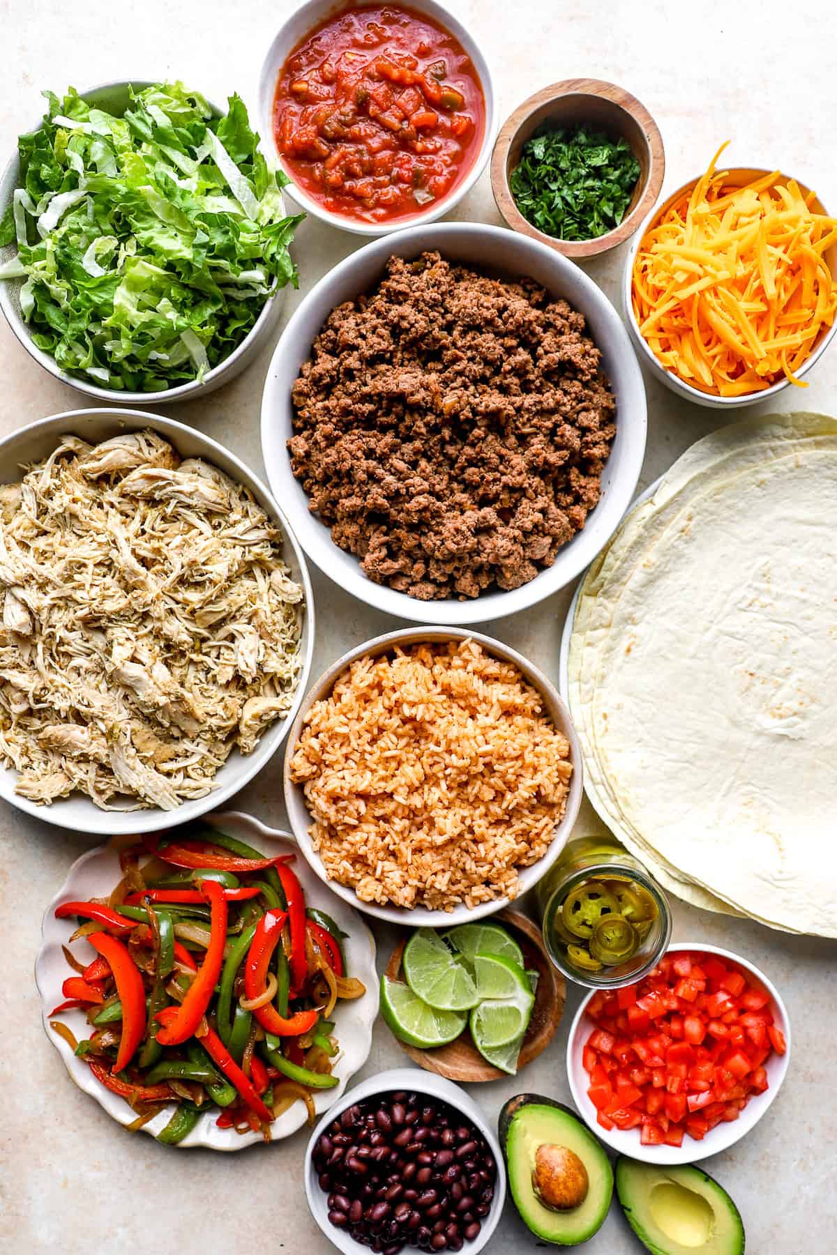 - Toppings: I use shredded romaine lettuce, diced tomato, shredded cheddar cheese, pickled jalapeños, diced avocado, lime, fresh cilantro, and salsa. I don’t freeze these ingredients!