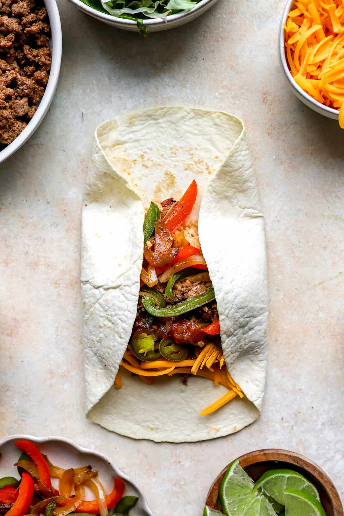 Go easy on ingredients with high water content. While we’re using salsa in the filling, be sparing if you add any extra salsa or sauce to the burritos. Too much can soften the tortillas.
