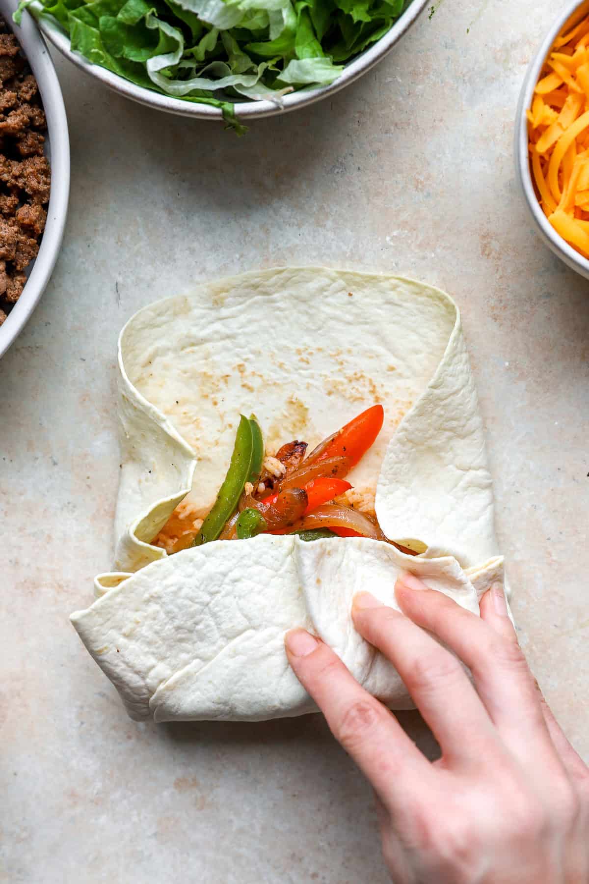 Fold in the left and right sides of the tortilla first, then wrap it from the bottom, using your fingers or a spoon to keep the filling inside the burrito.