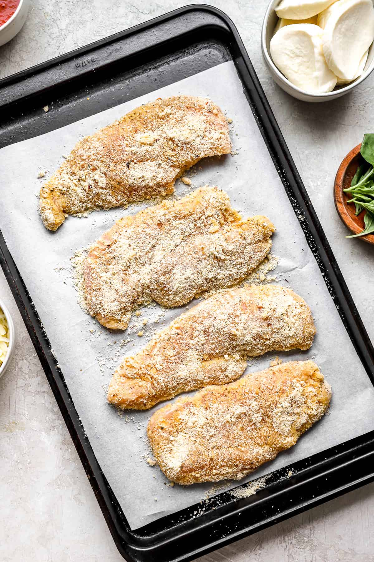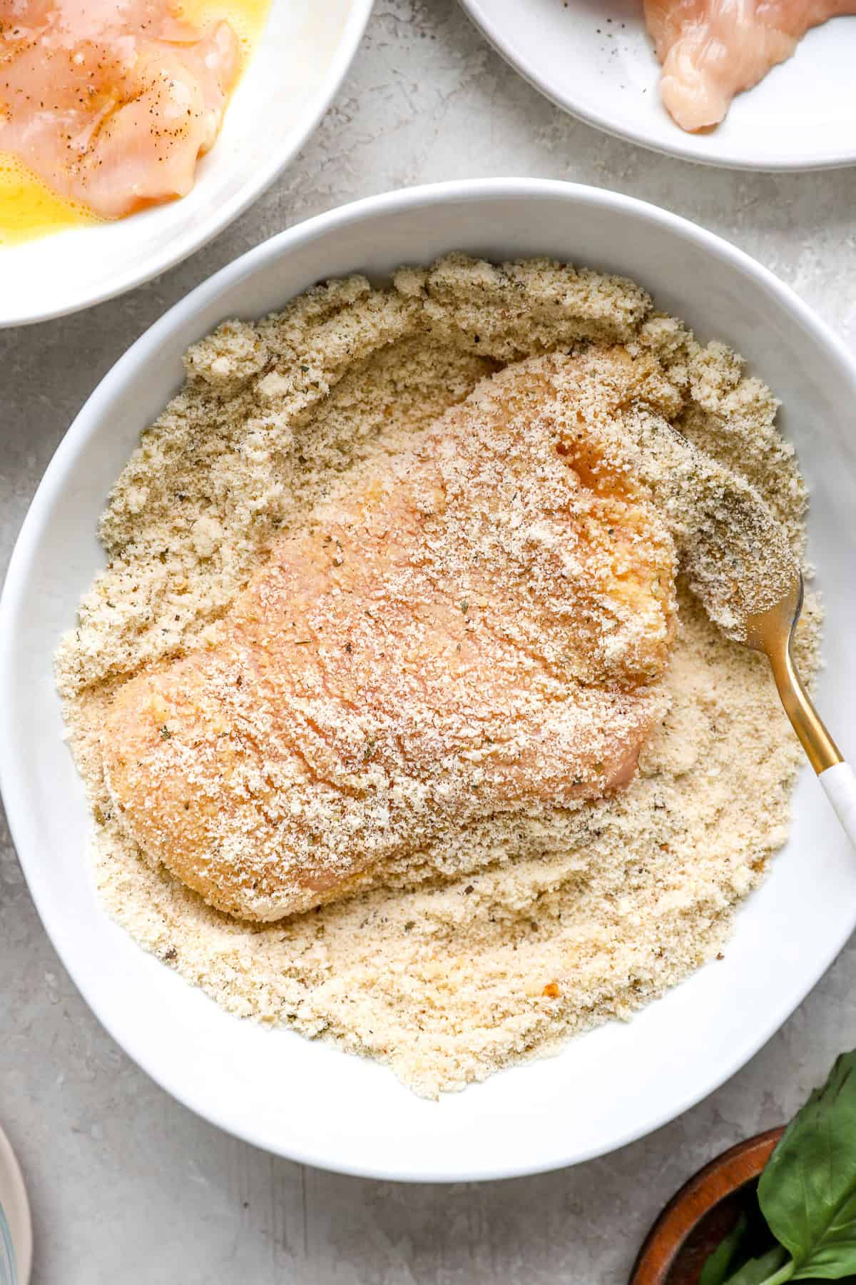 The almond flour soaks up the extra moisture while the egg helps the breading get that classic crispy texture we want in chicken parm!