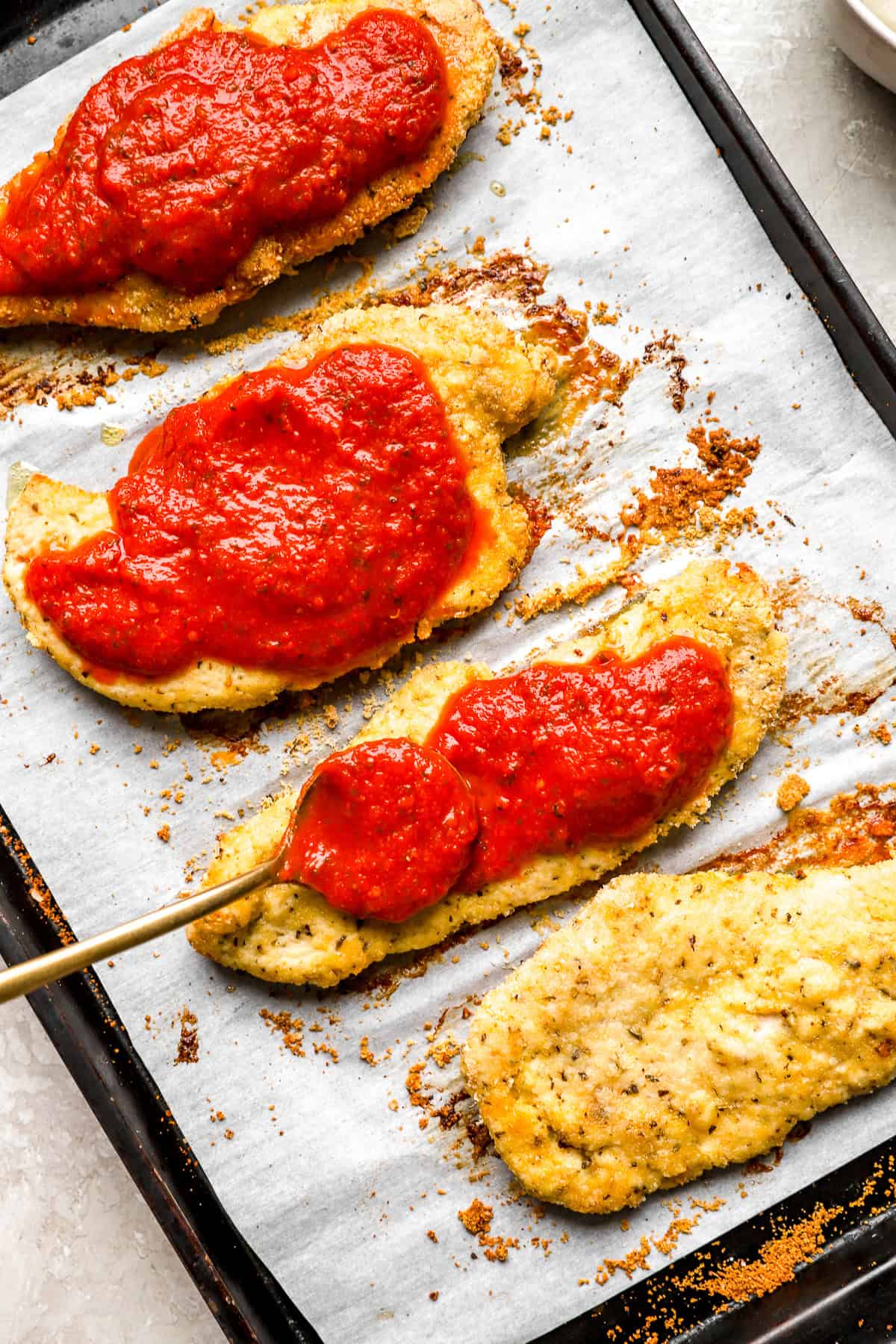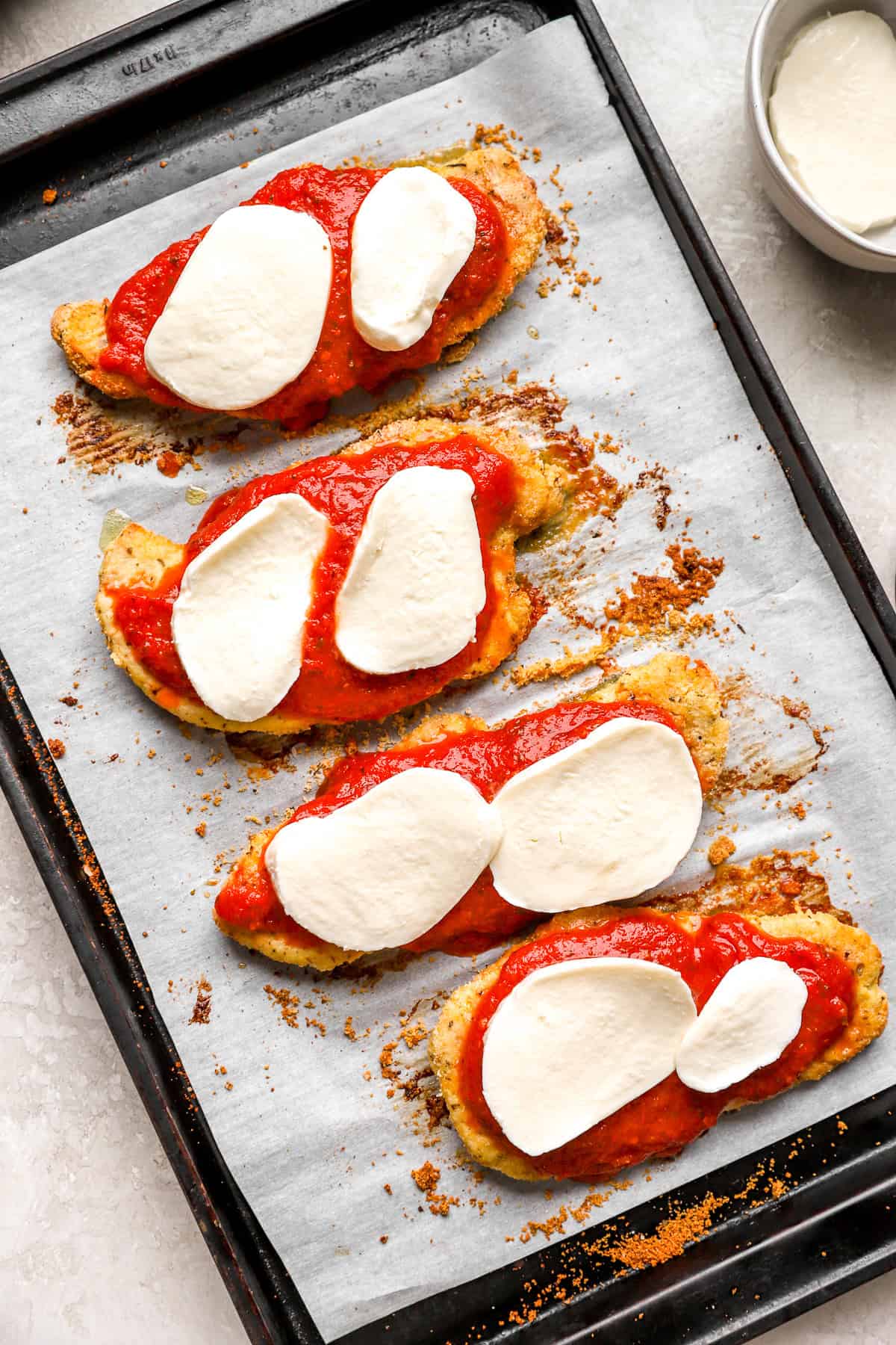 - Transfer the cooked chicken cutlets to a baking sheet. Spoon marinara sauce over each cutlet and top with cheese.